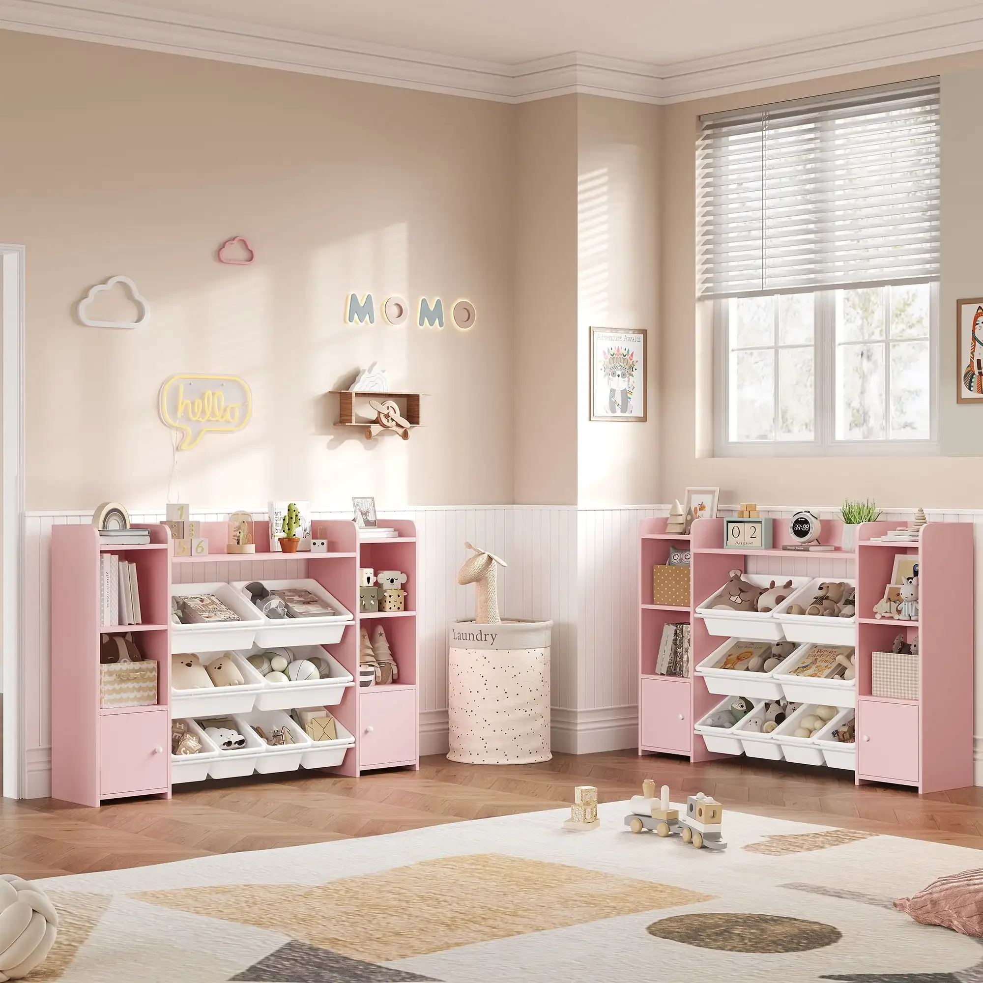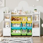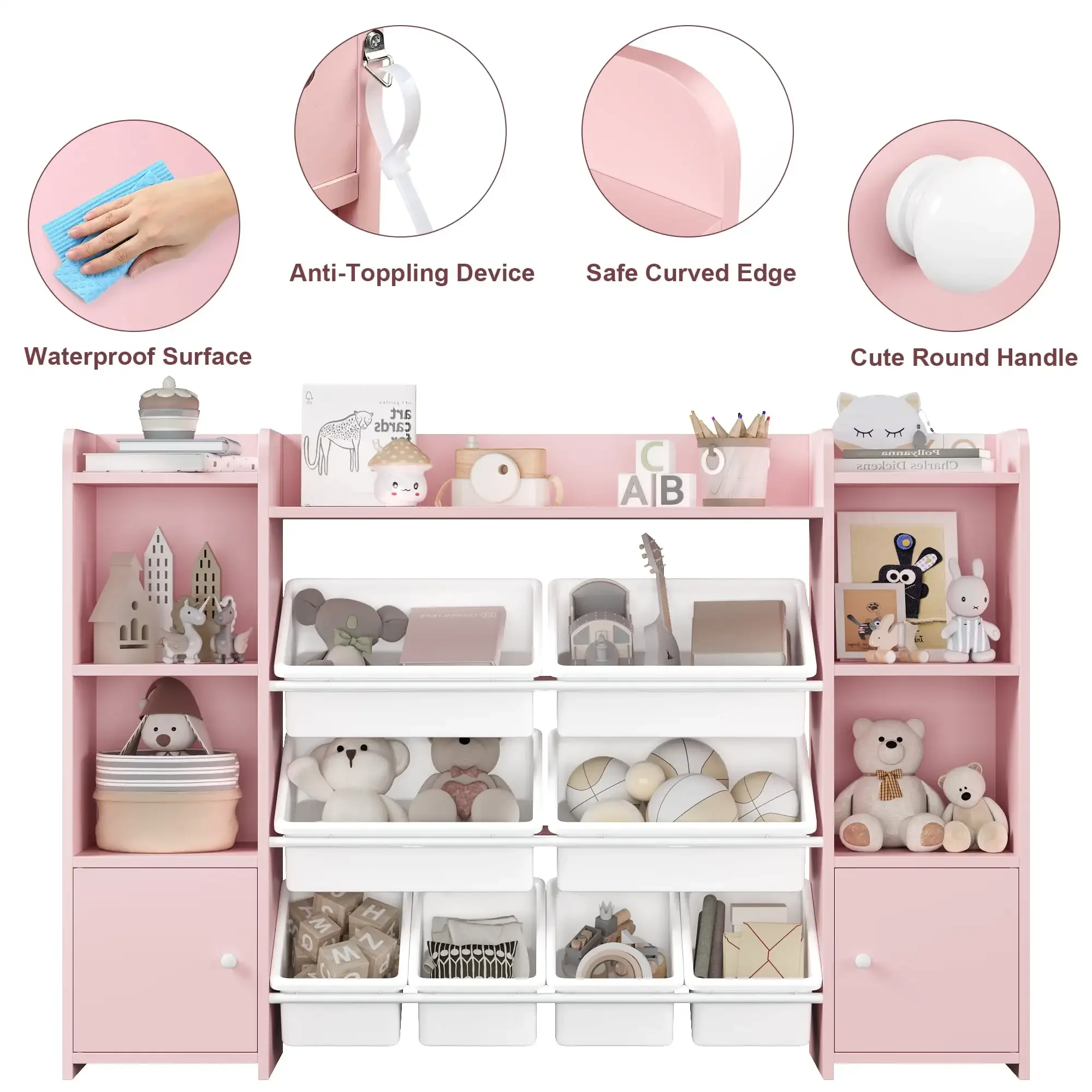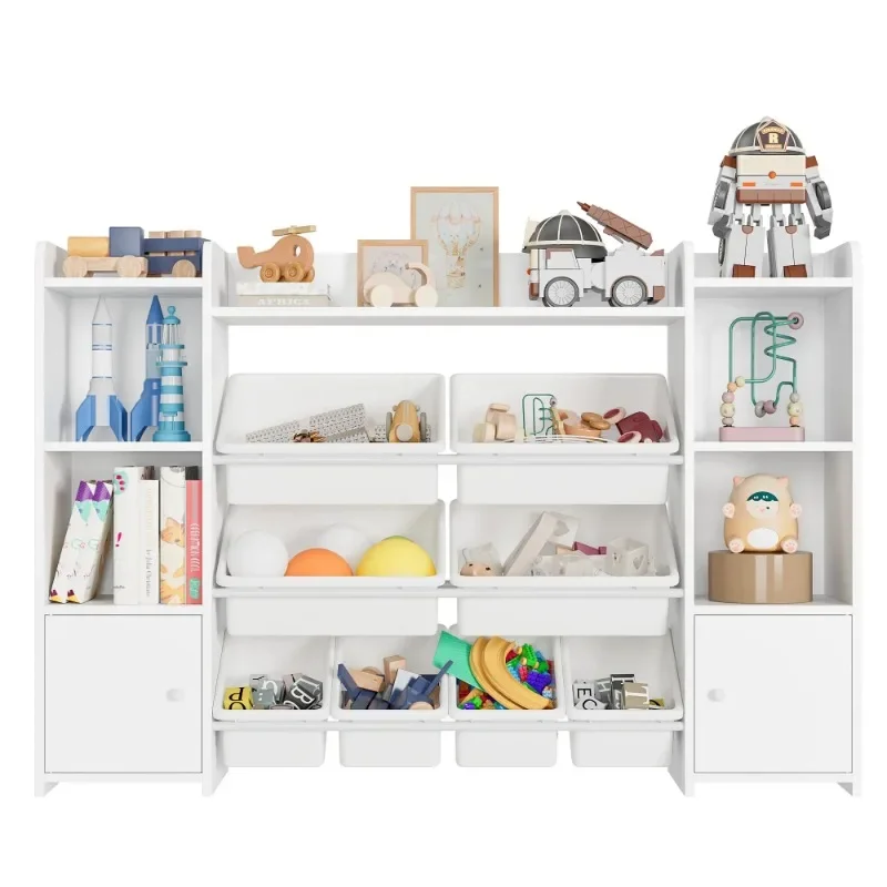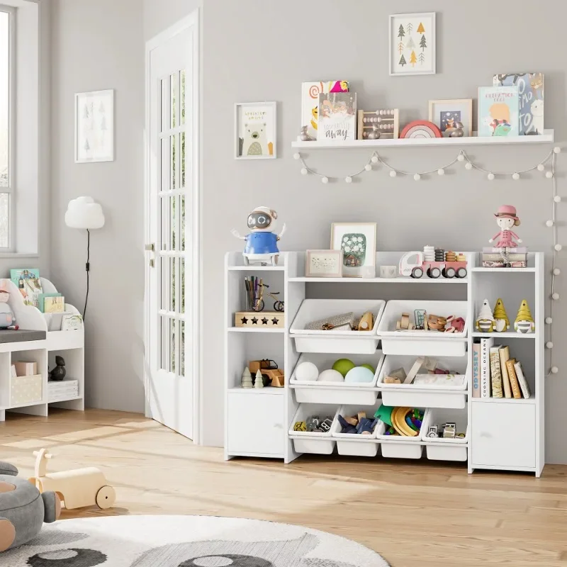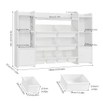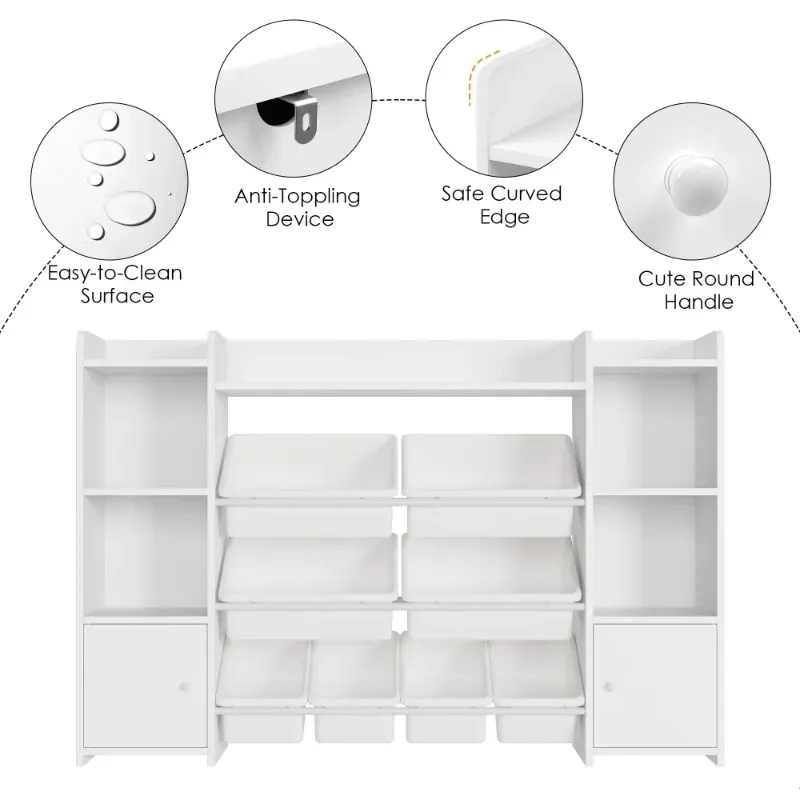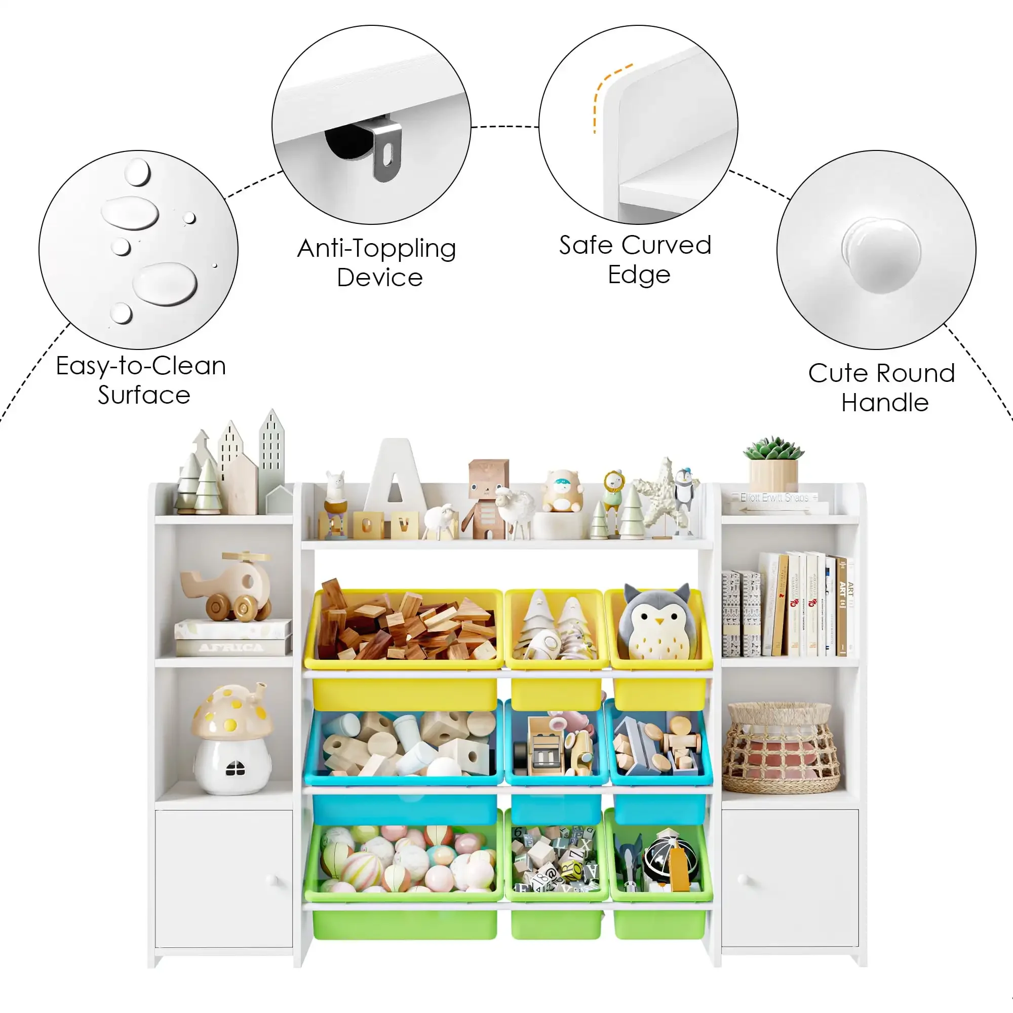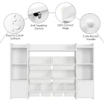 - 【Multifuncional Ample Storage Space】The combination of open bookshelves and closed door storage cabinets, with 9 white kids toy cubby bins in two sizes, easily meets the daily toys and books storage and stimulates children’s creativity.