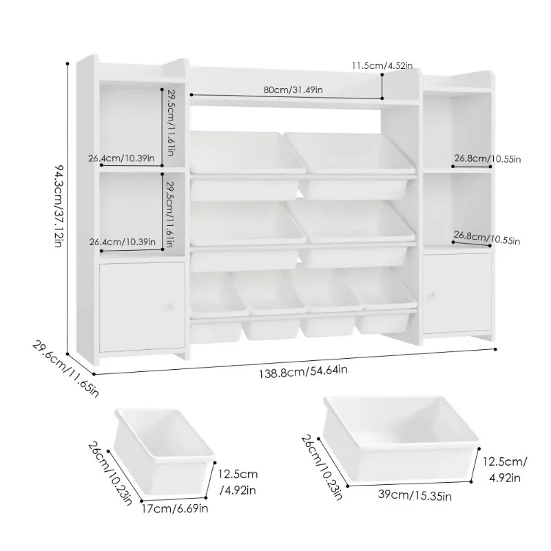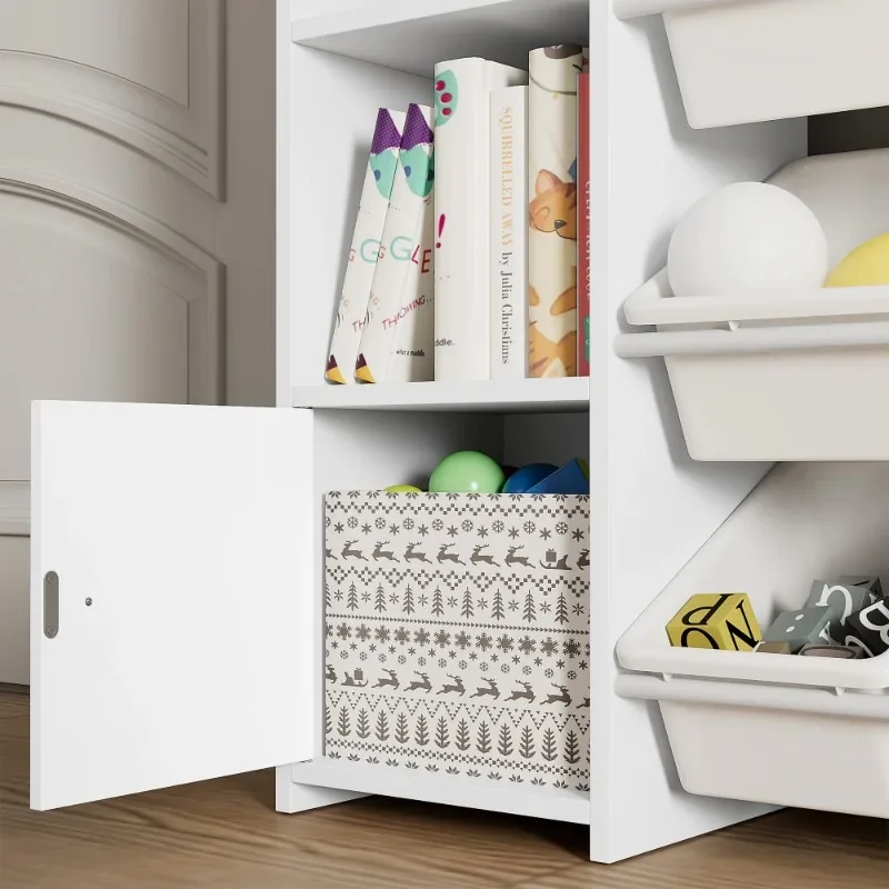 This toy storage cabinet will help your little one keep their books and toys neatly arranged and organized.The 37.12” height of wood white kids bookshelf is perfect, for which kid will be able to easily access even the items placed at the top of the kid bookcase. Books and small decorative items can be placed on the open shelves; the 8 white cubby bins in two sizes can be arranged in the way your little one like; and the storage shelves with doors, equipped with lovely round handles and high-quality hidden hinges, provide closed storage space for your child.