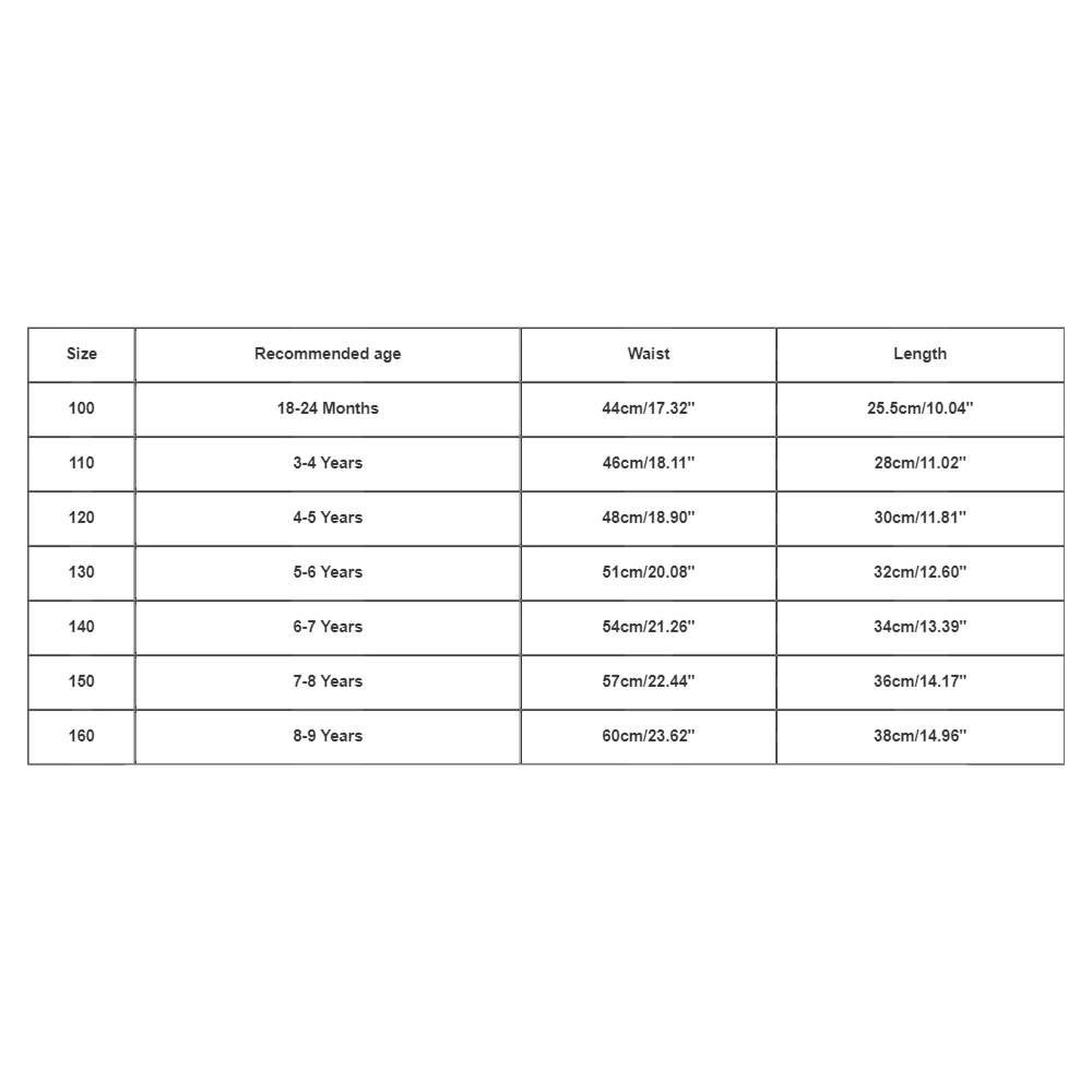 Size:140 Recommended age:6-7 Years Waist:54cm/21.26” Length:34cm/13.39”